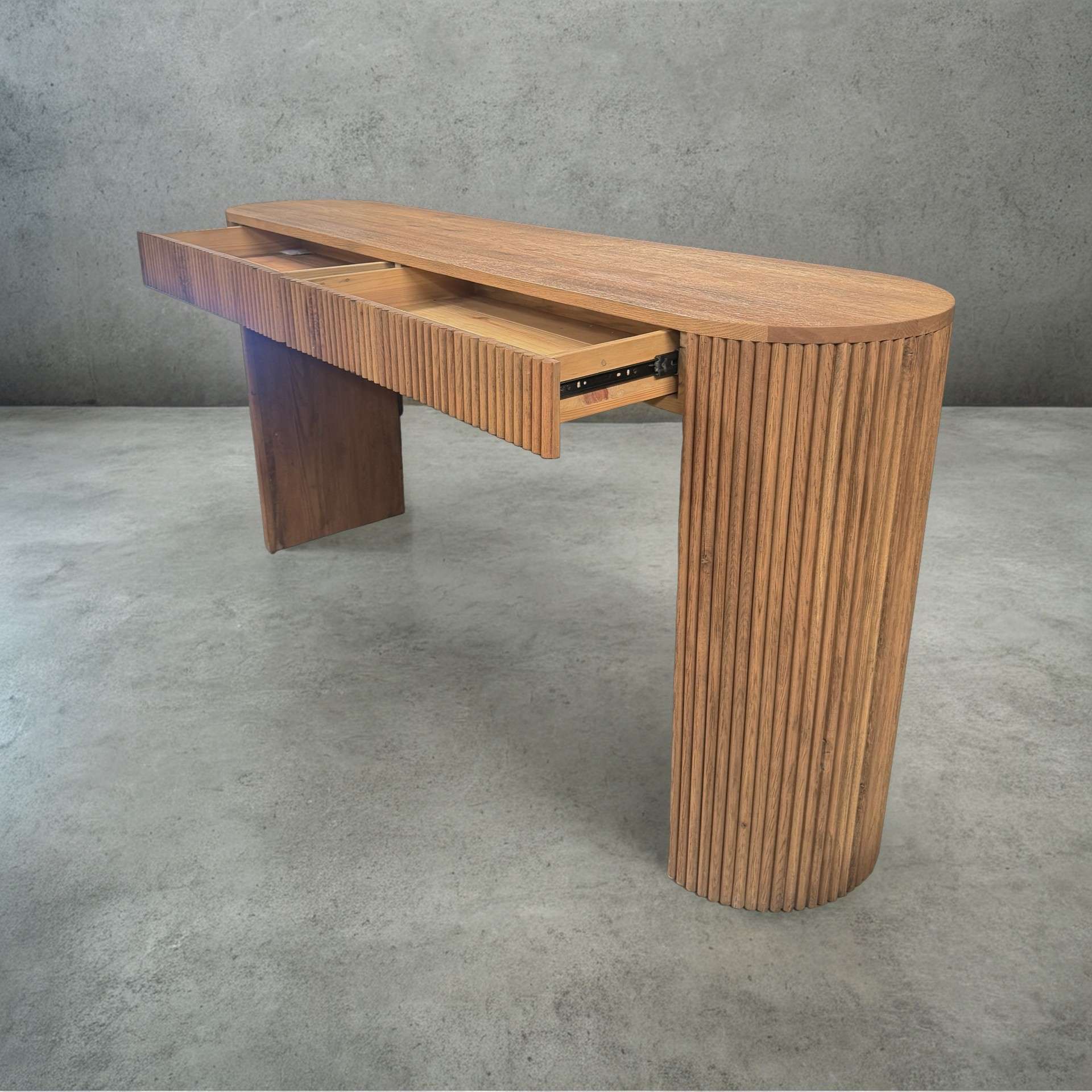 Crafted from 100% solid white oak, the Kensington Sofa Table blends modern elegance with timeless craftsmanship. Its fluted design and rounded corners add subtle texture and softness to your space, making it the perfect accent for an entryway, behind a sofa, or along a wall. Thoughtfully designed with two hidden drawers, it offers discreet storage without compromising its clean, sophisticated look.