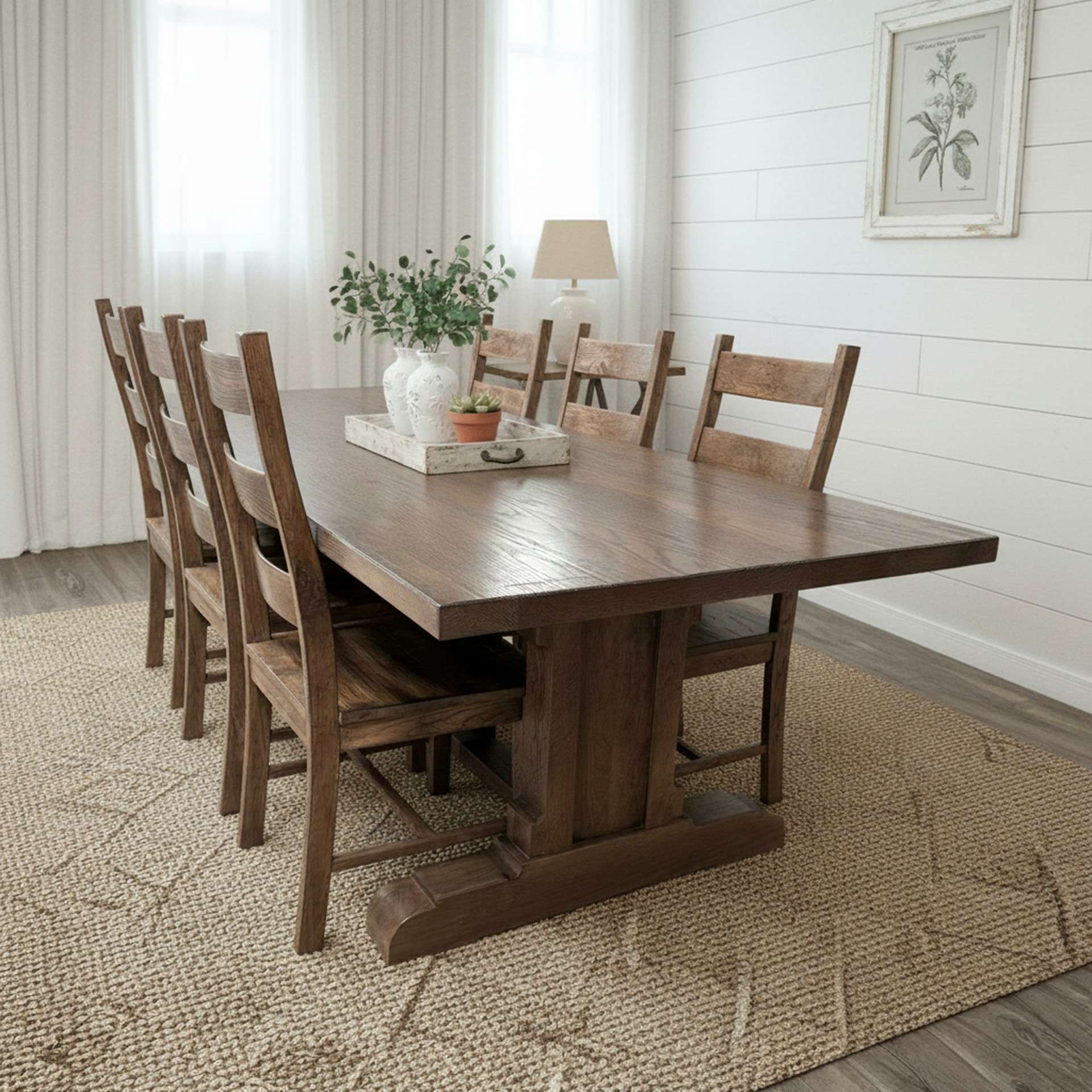 Elevate Every Mealtime Moment Introducing our Mayfair Dining Set, meticulously crafted from 100% solid oak. With an impressive 8.5′ long table boasting a robust 5″ thick base and a fully solid 2″ thick top, it’s a masterpiece of enduring craftsmanship. Finished in our timeless Distressed Brown oak stain, this set adds a touch of sophistication to any dining room. Indulge in the perfect blend of style and substance with the Mayfair Dining Set.