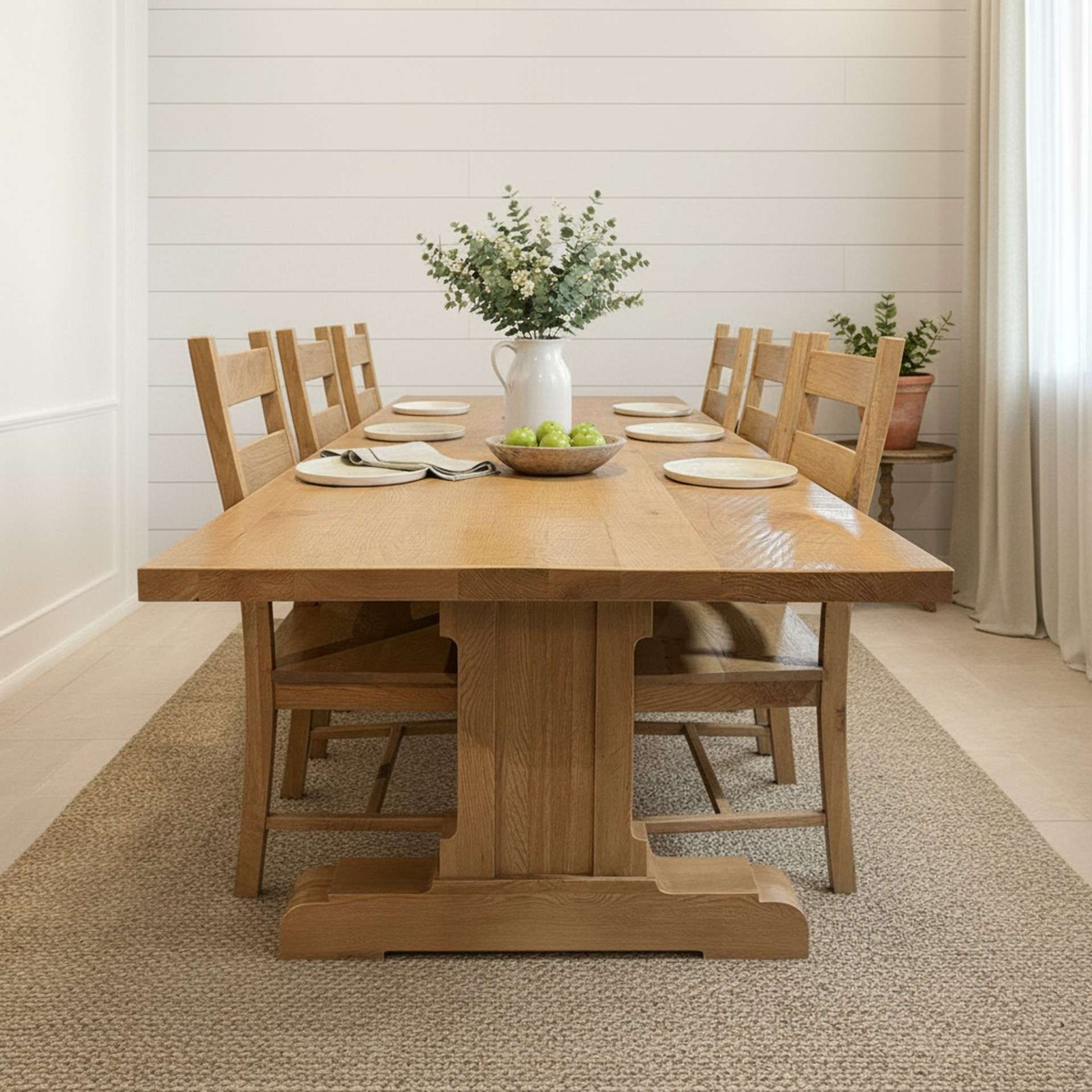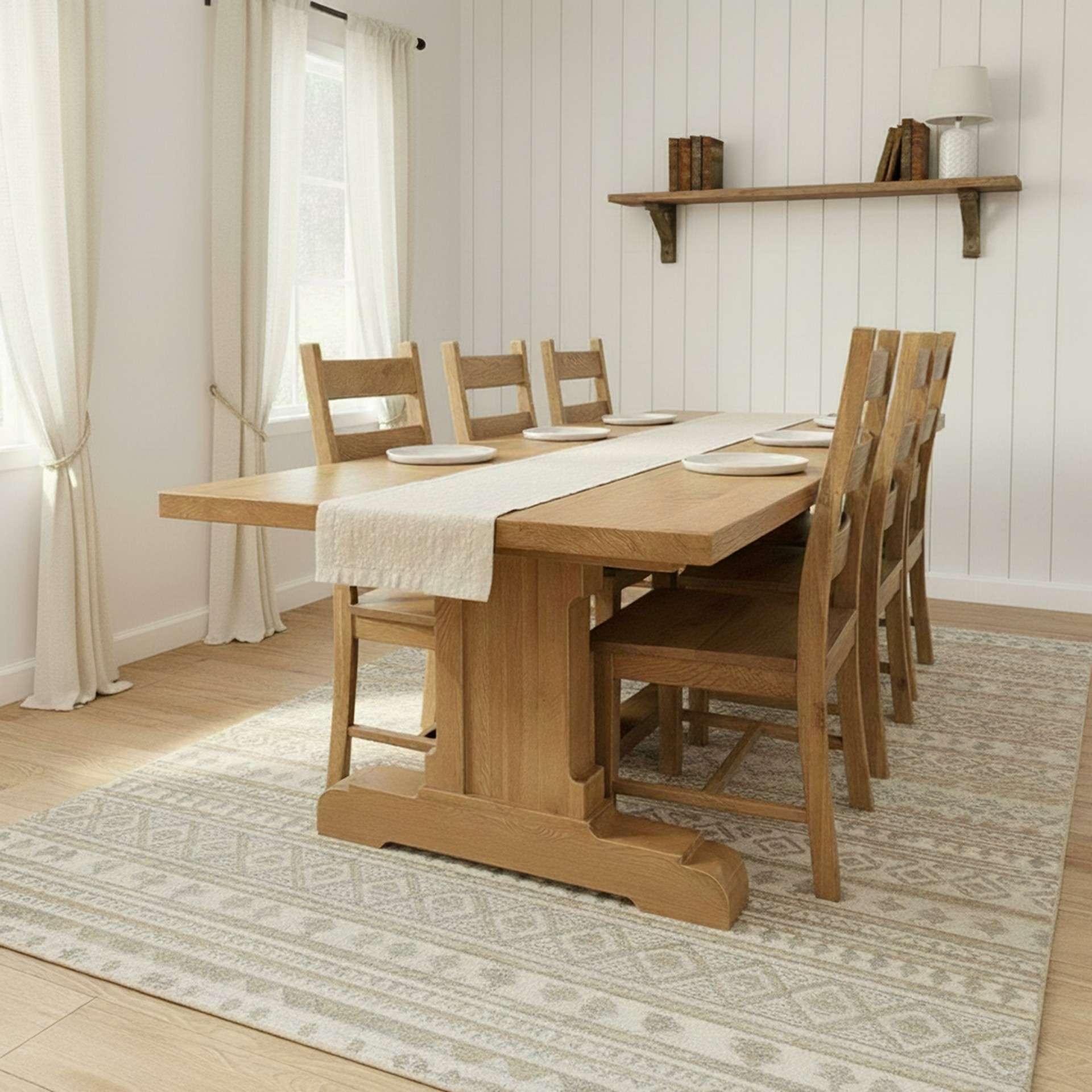 Elevate Every Mealtime Moment Introducing our Mayfair Dining Set, meticulously crafted from 100% solid white oak. With an impressive 8.5′ long table boasting a robust 5″ thick base and a fully solid 2″ thick top, it’s a masterpiece of enduring craftsmanship. Finished in our timeless Rhone oak stain, this set adds a touch of sophistication to any dining room. Indulge in the perfect blend of style and substance with the Mayfair Dining Set.