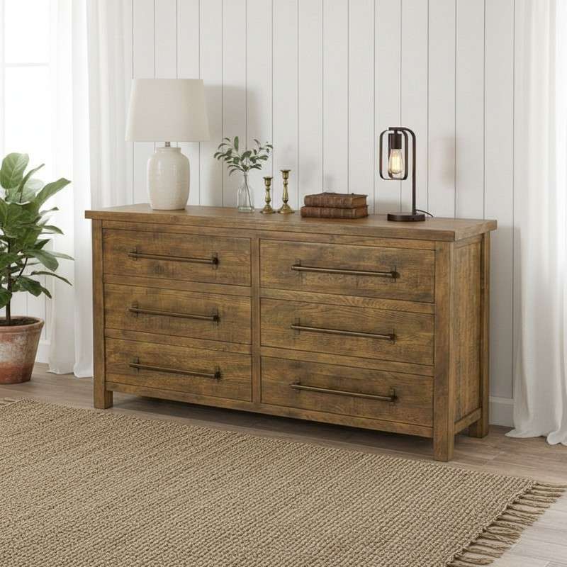 Six Drawer Brixton Dresser Made From Solid Oak Finished In Distressed Brown With Bar Handles.
